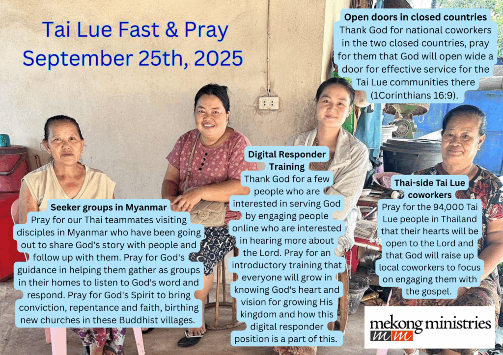 We trust the Lord to meet with you, lead you and through your prayers grow His kingdom among and through the Tai Lue people for His glory!